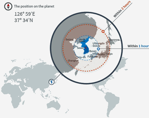 The Korean Peninsula lies in the center of Northeast Asia. The coordinates of its capital, Seoul, are 37.34° N and 126.59° E, putting it in close proximity to the Yellow Sea. Seoul is within a three-hour flight from 43 cities with populations of over one million people. Korea’s location between China and Japan has been a great geographical advantage for the nation.