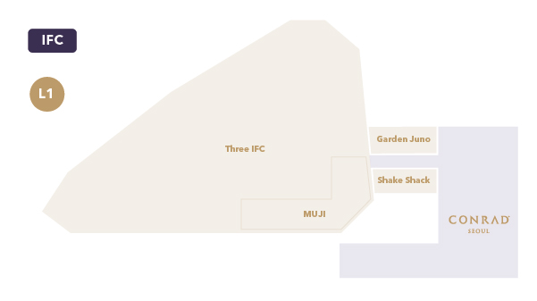 Go straight along the moving walkway at the exit 3 of the Yeouido station > Come into the Three IFC Entrance Go to L1 by taking the escalator up, which is located in front of MUJI > Entrance to Conrad Seoul is located between Garden Juno and Shake Shack