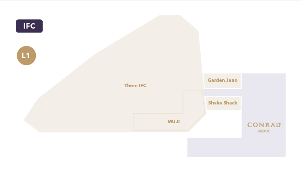 Go straight along the moving walkway at the exit 3 of the Yeouido station > Come into the Three IFC Entrance Go to L1 by taking the escalator up, which is located in front of MUJI > Entrance to Conrad Seoul is located between Garden Juno and Shake Shack